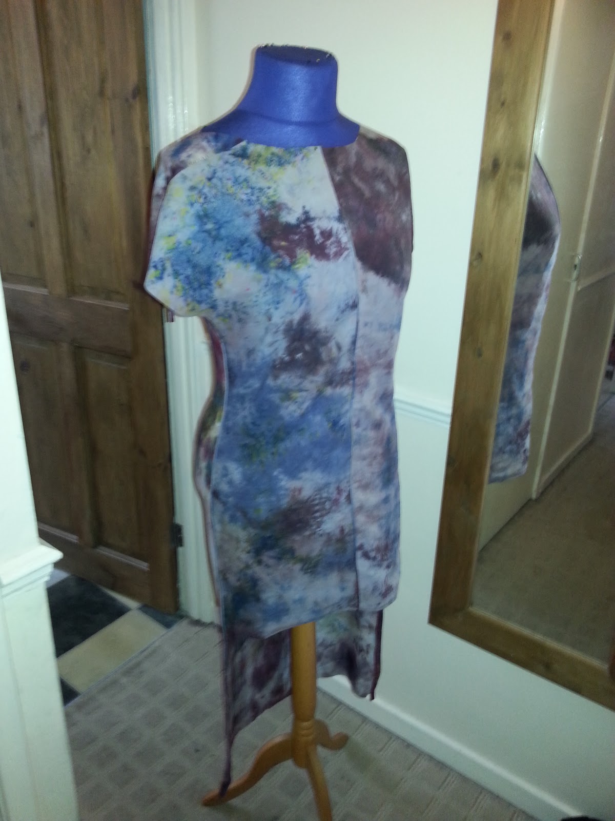 I have made my drafted pattern and my toile, this outfit I left to the end as I believed it was the easiest one of the four, I am happy i did so as It was quite easy to draft the pattern, I will need to make sure I have enough fabric to fulfil with pattern as it will require a wide pattern that includes the sleeve as there are no seams just side seams.I have also had a think about the bottom of the dress. My initial design showed a lot of fabric at the bottom, the was wider than the area the the dress first hits the floor, this would require the fabric being made larger at the point of weaving the fabric, I am not fortunate enough to be able to weave my fabric, so I needed to come up with an alternative design that stayed true to my original.